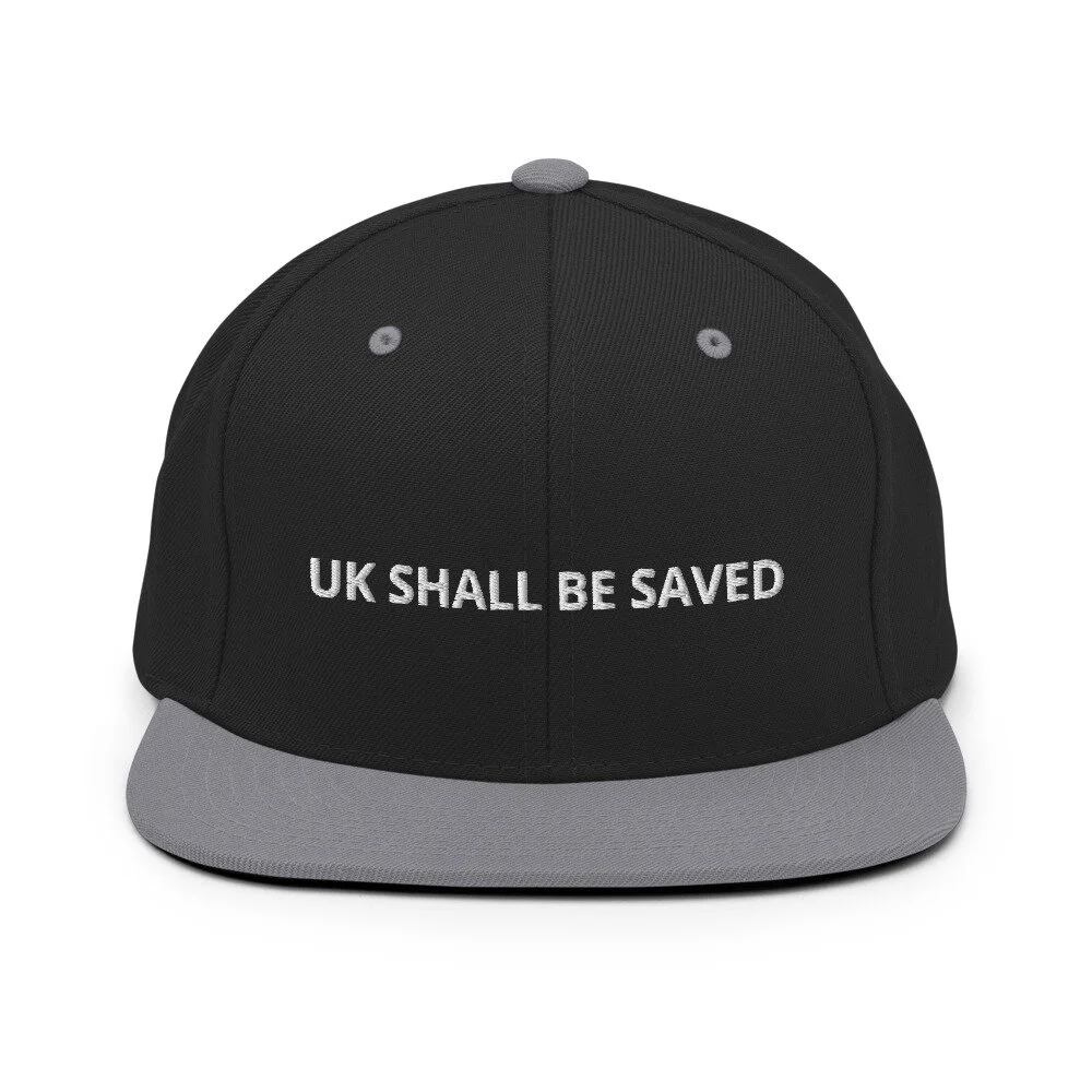 Image 1 of 1 UK SHALL BE SAVED Snapback Hat £17.00 This hat is structured with a classic fit, flat brim, and full buckram. The adjustable snap closure makes it a comfortable, one-size-fits-most hat. • 80% acrylic, 20% wool (green camo is 60% cotton, 40% polyester) • Structured, 6-panel, high-profile • Plastic snap closure • Green under visor • Head circumference: 21 ⅝” - 23 ⅝” (54.9 cm to 60 cm) Add To Cart Added! This hat is structured with a classic fit, flat brim, and full buckram. The adjustable snap closure makes it a comfortable, one-size-fits-most hat. • 80% acrylic, 20% wool (green camo is 60% cotton, 40% polyester) • Structured, 6-panel, high-profile • Plastic snap closure • Green under visor • Head circumference: 21 ⅝” - 23 ⅝” (54.9 cm to 60 cm)